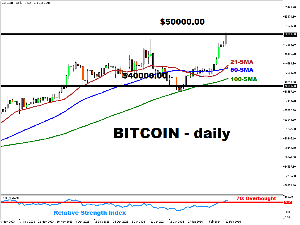BTC Bulls are trying to maintain strong upward momentum, following the 7 day streak, during which the psychologically important $50000 mark has been reached for the first time since 2021.