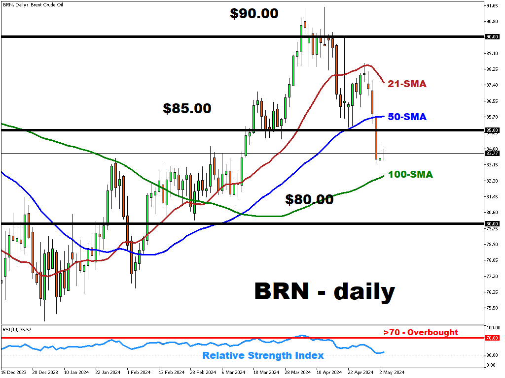 - To the downside, $83 is set to provide an immediate support, while to the upside, the 50-period SMA could be the key resistance/target level for the BRN bulls