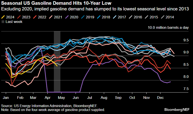 On the demand side, despite the approaching summer (major driving season) in the US, implied demand (reported by the EIA and based on the 4-week average of product supplied) has fallen for four consecutive weeks and is now at its lowest seasonal level since 2013 (source: Bloomberg).