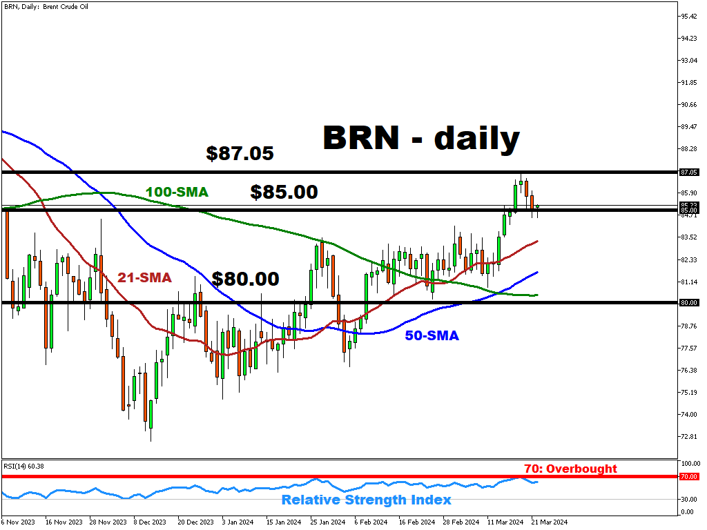 - To the downside the key support level is located at $85/bbl round number, while to the upside the $87.05/bbl (this week’s high) may act as a key resistance/target for the BRN bulls