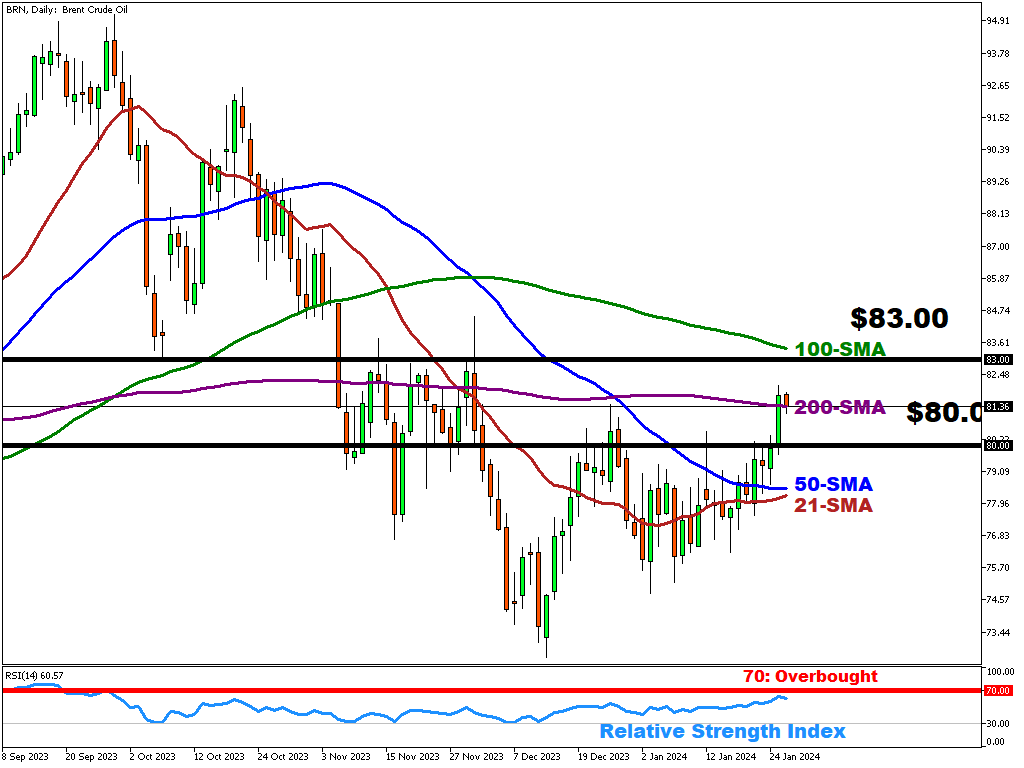 - 200-period SMA (~$81.378) is set to offer an immediate support, followed by the psychologically important $80/bbl