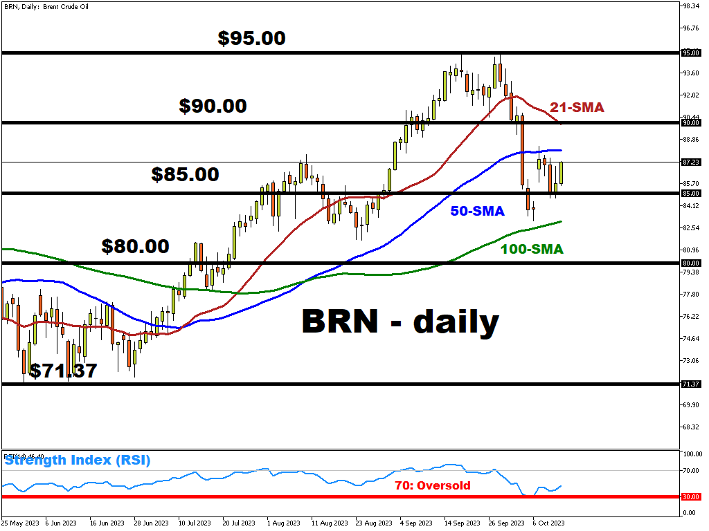 - A potential consolidation pattern may from within $85-$88 as investors await new market developments surrounding the ongoing Middle East conflict, as well as the next policy moves by major central banks