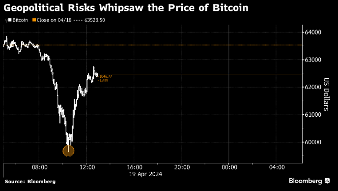 Bitcoin has rebounded and is now trading above yesterday’s close (>63533.22) following the overnight escalation between Iran and Israel.