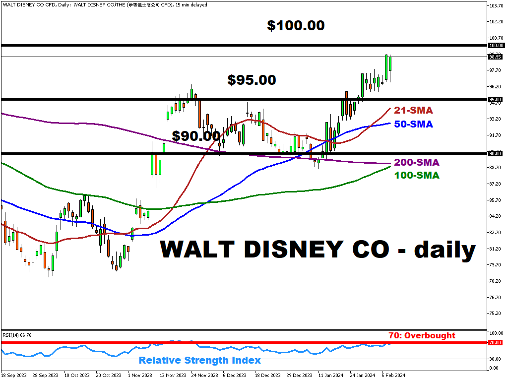 - The psychologically important $100 level may be the next major target for the Disney bulls in the near future