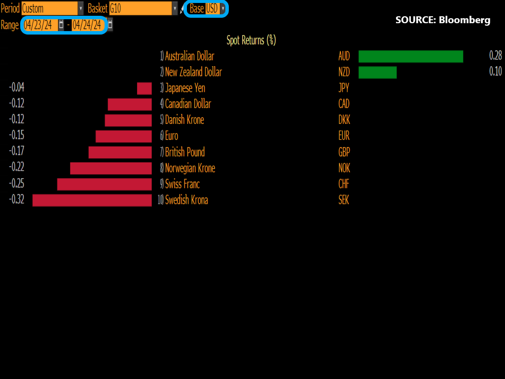 Given all the above, no surprise that the Aussie is outperforming its G10 peers against the US dollar so far today (Wednesday, April 24th).
