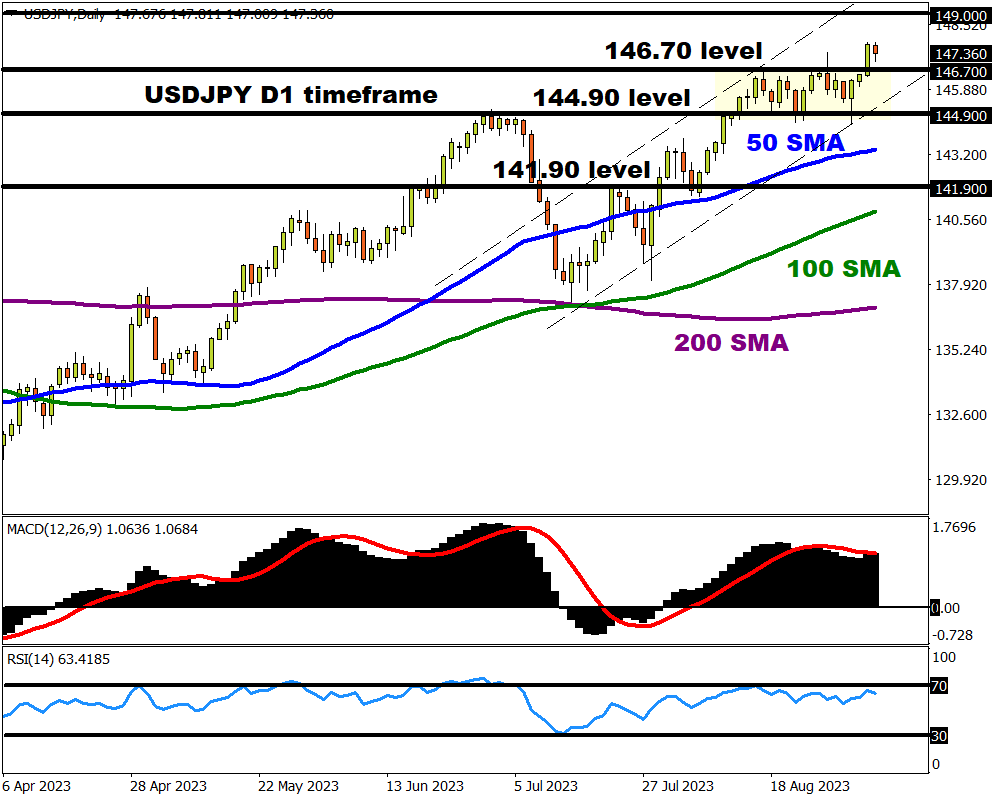 After breaking and securing a daily close above the 146.70 resistance yesterday, the USDJPY could see further upside from a technical perspective. The next key level of interest can be found at 149.00. A move back below 146.70 may open a path back towards 144.90.