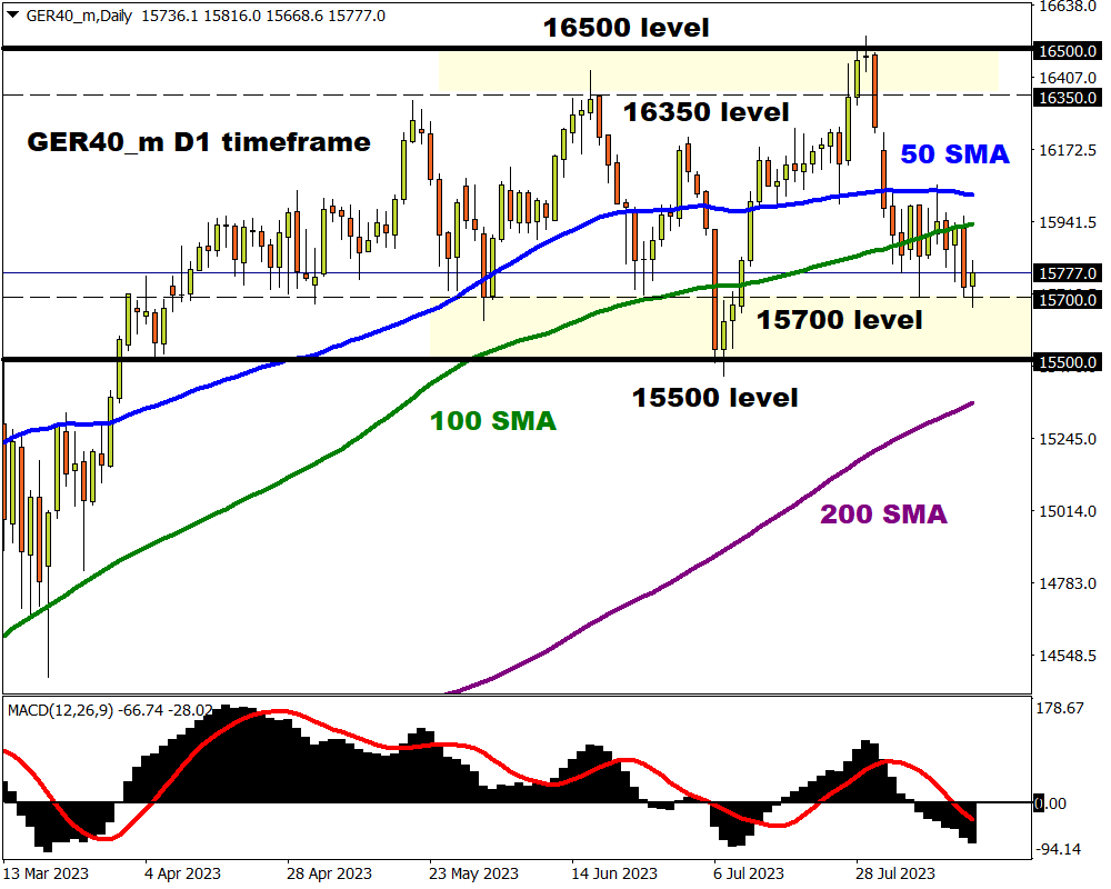 The GER40 Index has been trapped within a range since April 2023 with major support at 15500 and resistance at 16500. Prices are trading below the 50 and 100-day SMA while the MACD trades to the downside. A break below 15700 may see prices test 15500. If bulls can take prices back above the 50-day SMA, the next key level of interest can be found at 16350.