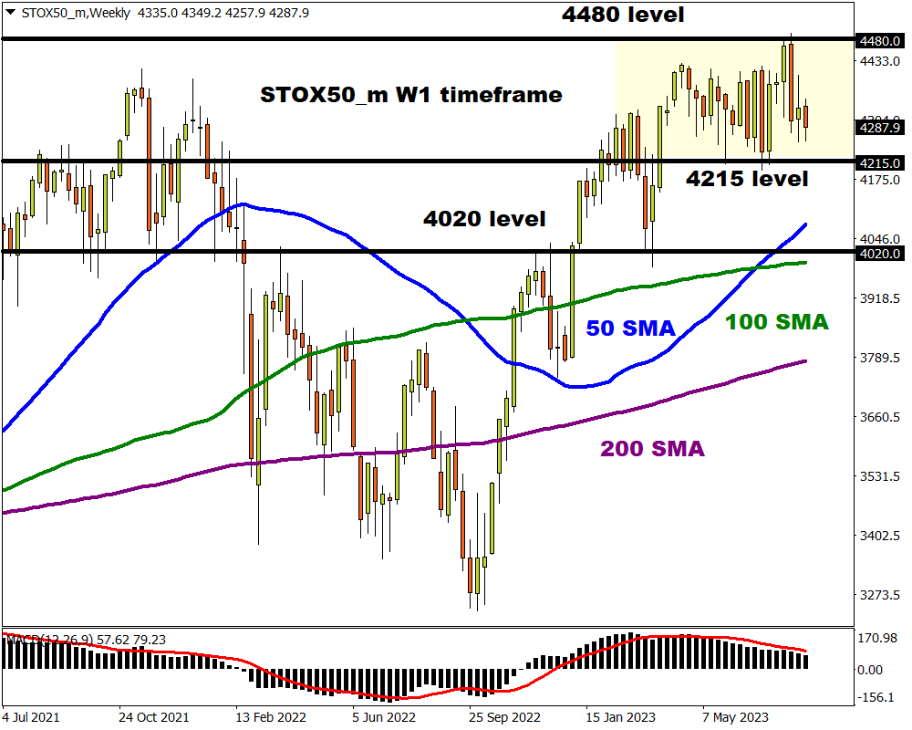 As the subtitle says, the STOX50_m remains a choppy affair on the weekly charts. Support can be found at 4215 and resistance at 4480. A decline below 4215 may see bears target 4020, a level just above the 100-week SMA.