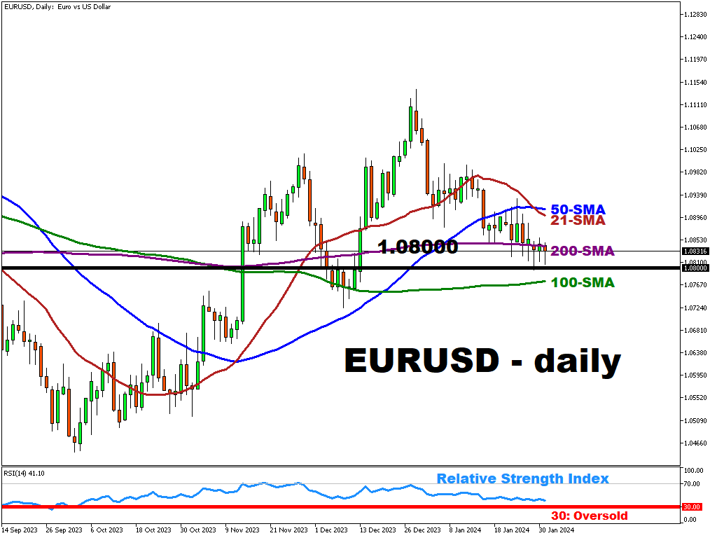 EUR/USD is moving down away from its 200-day simple moving average at 1.0840 and could test the 1.08 level and this week’s low at 1.0795 with soft data and a more hawkish Powell.