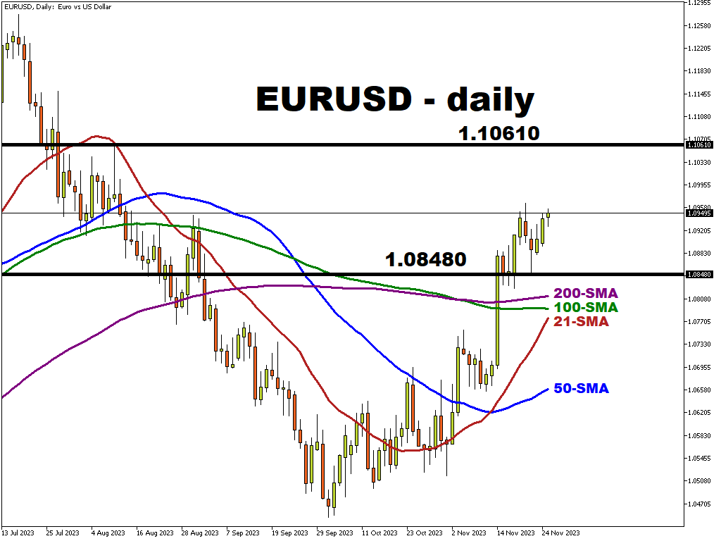 If Chair Powell can push back on market bets over US rate cuts next year, that may support the US dollar while potentially delaying the quest by euro bulls to reclaim the psychologically-important 1.10 level.