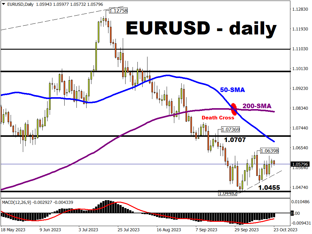 However, EURUSD will remain sensitive to what the Governing Council and ECB President Christine Lagarde has to say about how long its benchmark rates will be kept at this peak, with markets predicting the first rate cut to arrive only by June 2024.