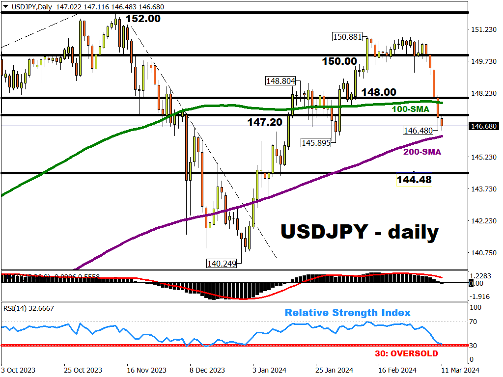 USDJPY has broken down this week after consolidation above 150 in the last two weeks of February.