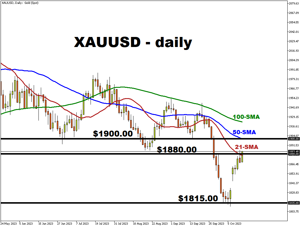 - XAUUSD is set to test an immediate resistance level at $1878.036 (21-period SMA)