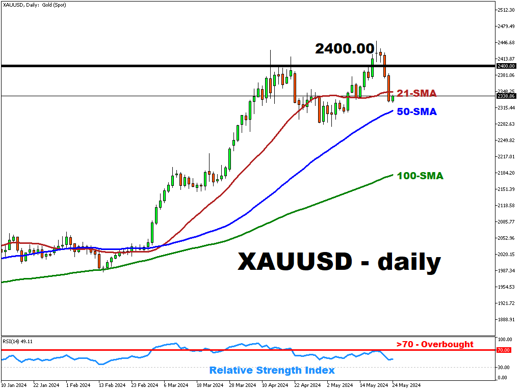 A break above the 21-period SMA could push the price higher towards the psychologically important $2400 level.