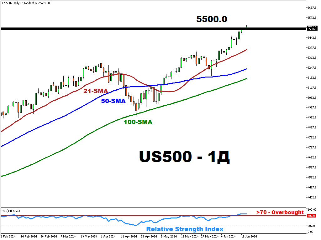 На daily-графике торгов индексом S&P 500 сохраняется вероятность подъема к 5500 п.